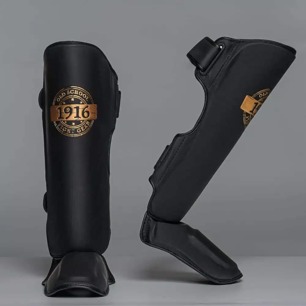 De matte afwerking in combinatie met het klassieke old-school logo in zwart en goud geeft deze scheenbeschermers een chique en professionele uitstraling, ideaal voor vechters die stijl en functionaliteit willen combineren.