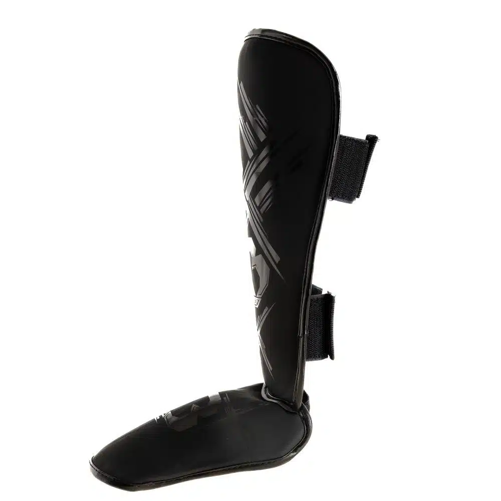 De scheenbeschermers zijn gemaakt van duurzaam kunstleer en bieden uitstekende schokabsorptie. Dankzij de twee verstelbare klittenbandsluitingen aan de achterkant blijven ze stevig op hun plaats, zelfs tijdens intensieve trainingen. Het voetgedeelte is ergonomisch gevormd en wordt op zijn plek gehouden door twee elastische banden, wat zorgt voor een comfortabele en veilige pasvorm.