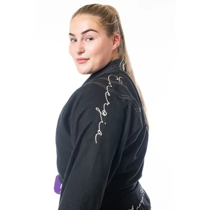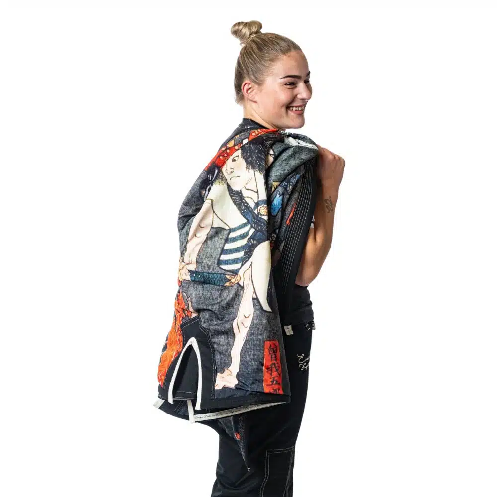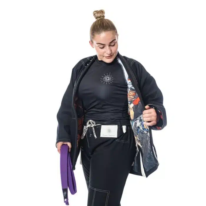 Een unieke, diep zwarte, gi met veel details en met een verhaal er achter. Voor de stof kozen we een lightweight 350gsm weave om te compenseren voor de inside lining. Alsof je een zijde kimono aantrekt dus!