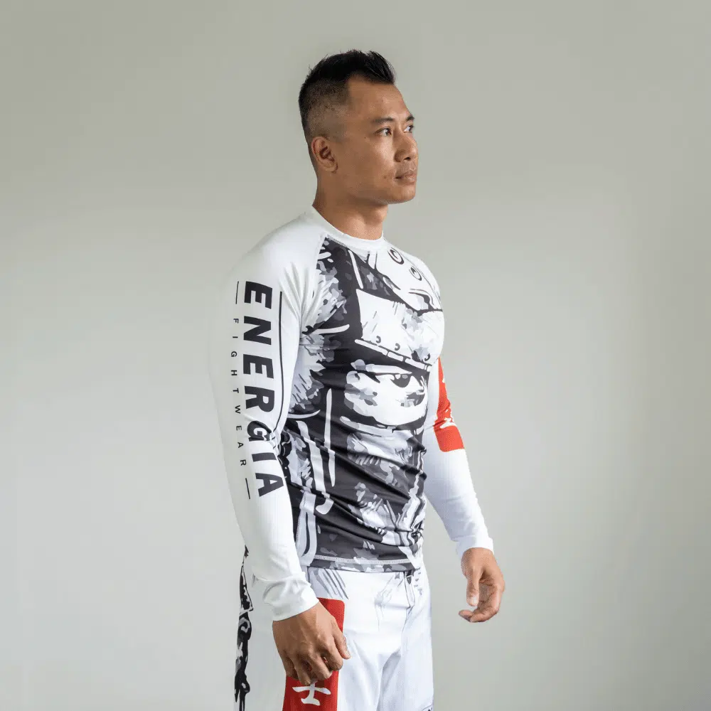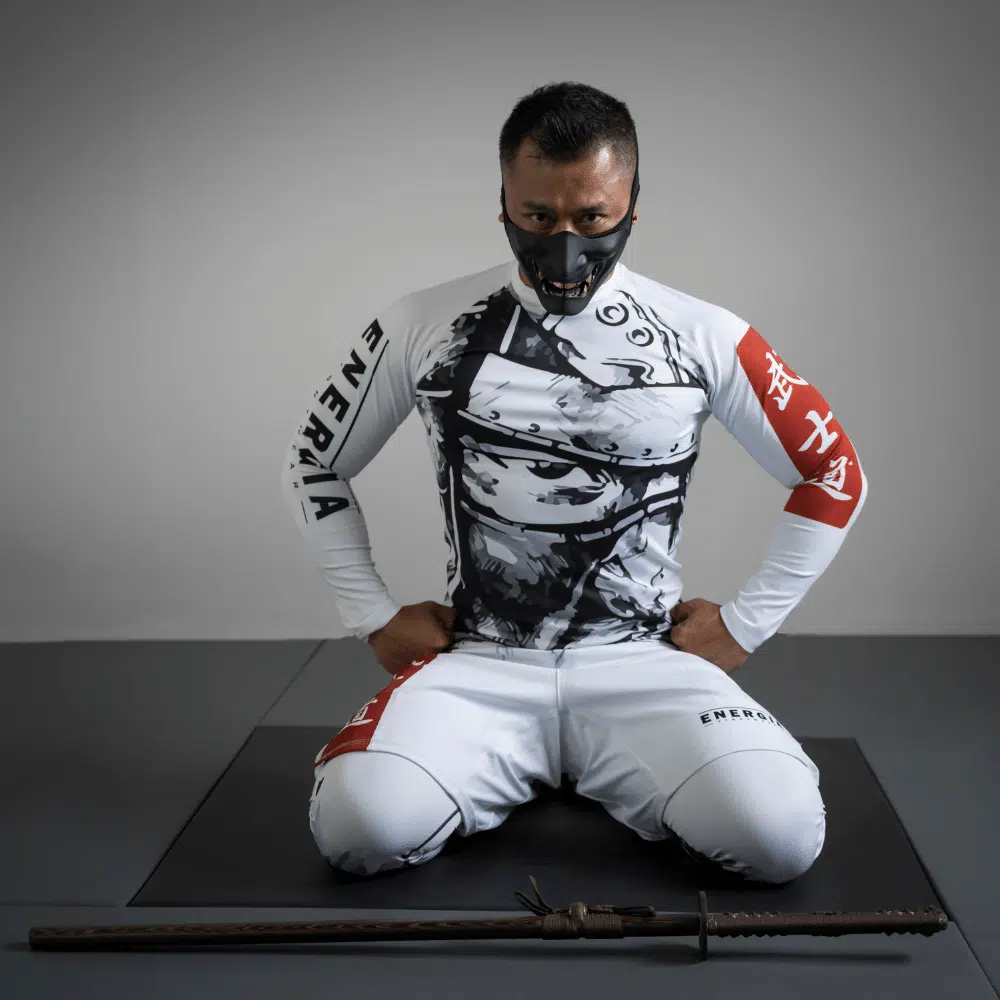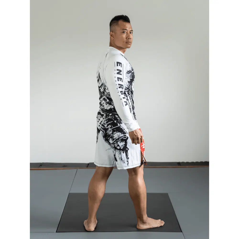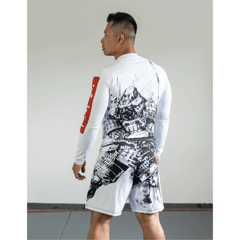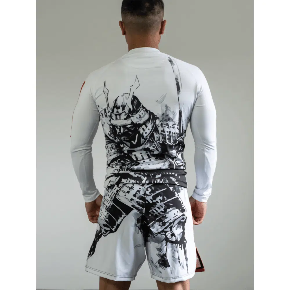 De Bushidō code staat duidelijk centraal op dit design. Een machtige samurai krijger afgebeeld over de gehele set maakt dit design écht uniek. De rug van de rashguard en de shorts lopen in elkaar over.Al onze rashguards zijn van hoge kwaliteit voor zowel comfort als duurzaamheid. Om dat zo te houden was je ze op een fijn programma, niet te warm en niet met shorts samen (de valcro sluitingen beschadigen de fijne rashguards).