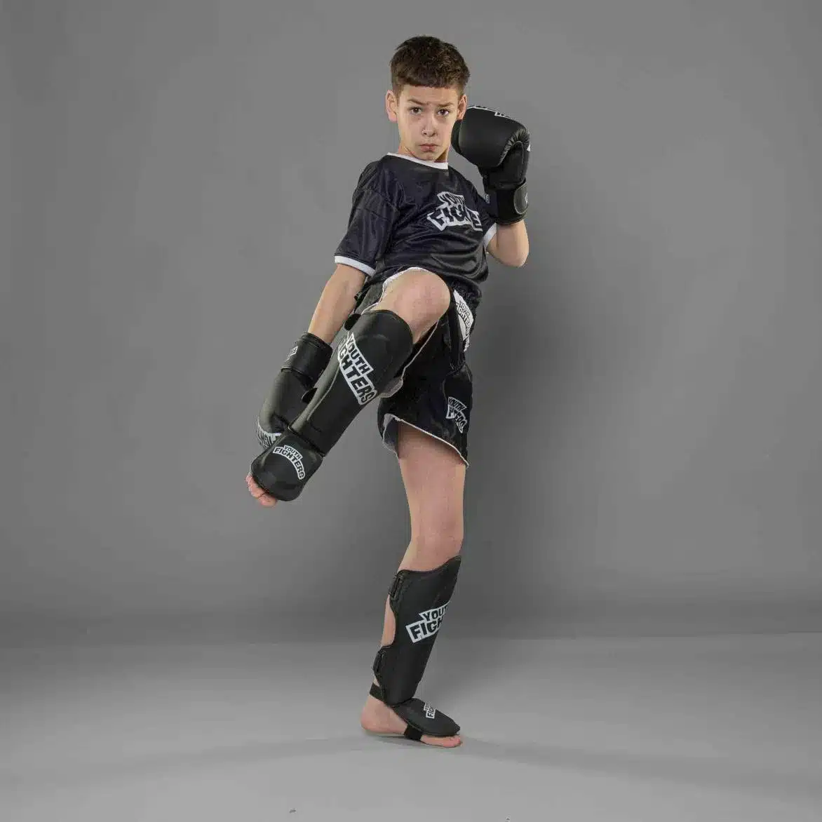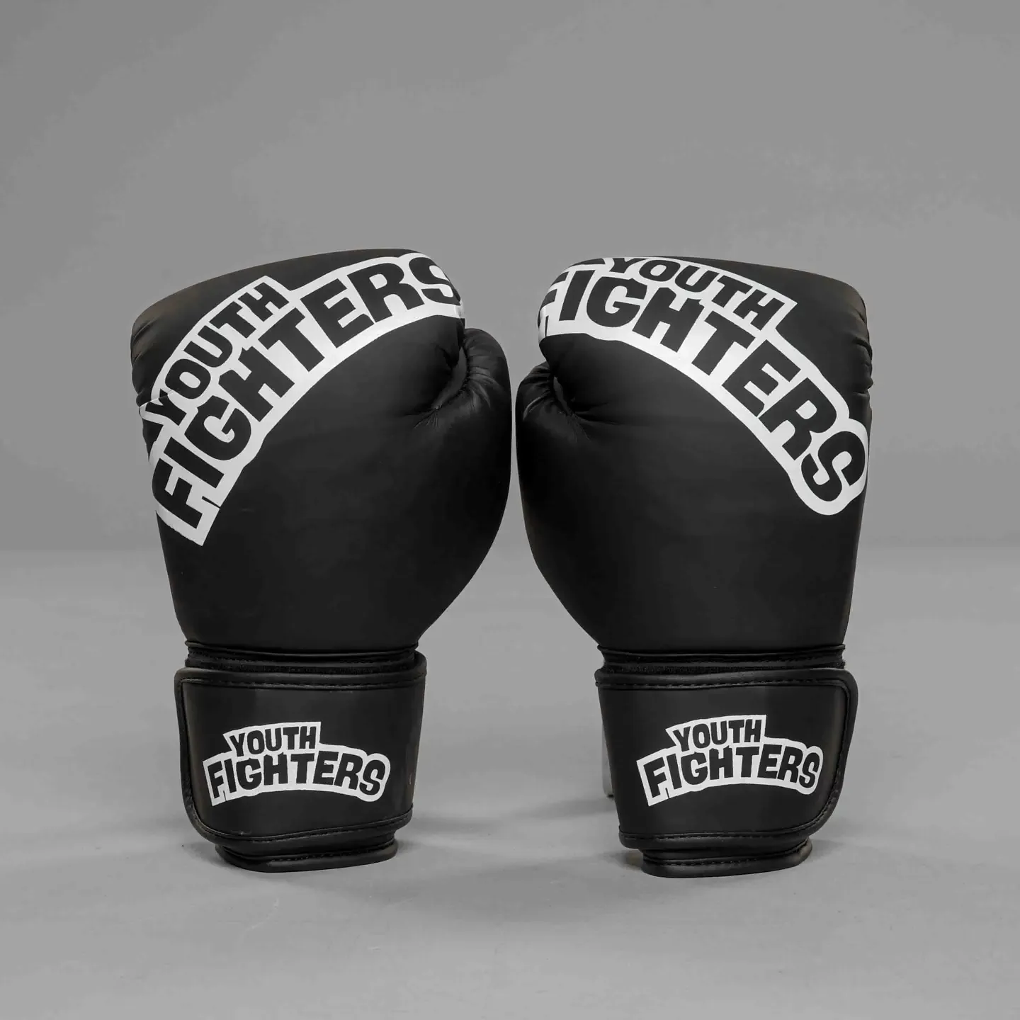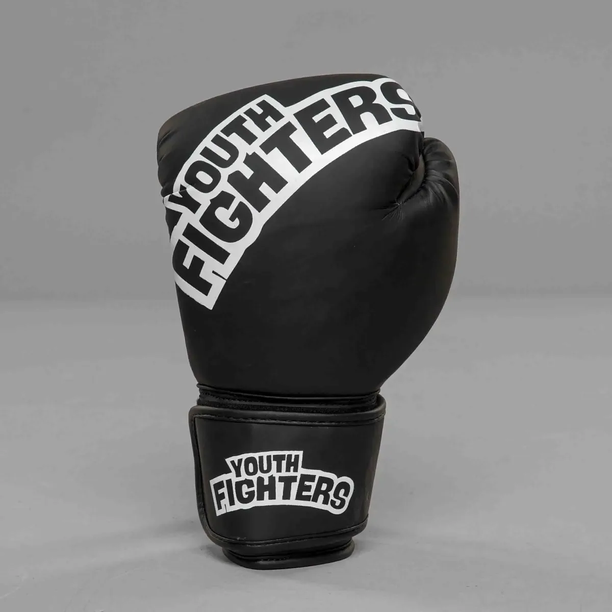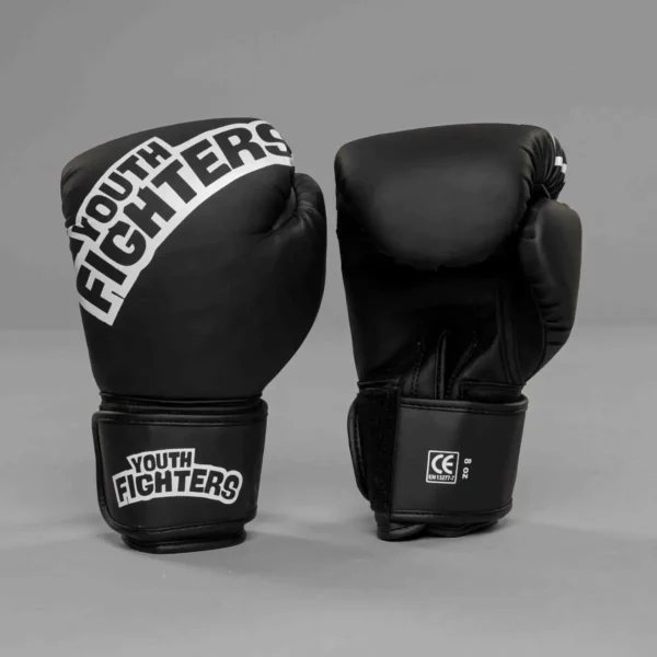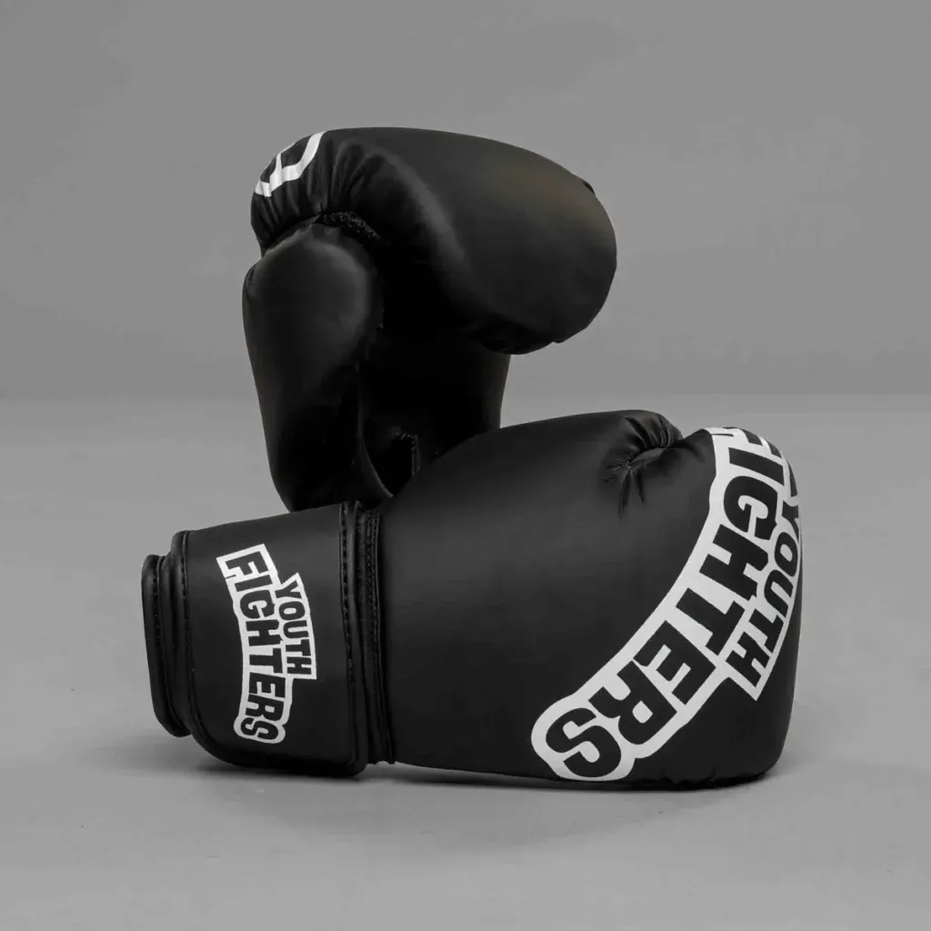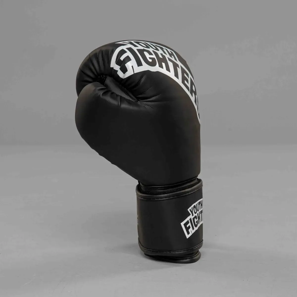 Met de Youth Fighters Bokshandschoenen Black kies je voor een tijdloze en krachtige look in de ring. In tegenstelling tot de grafische prints uit deze serie, heeft dit model een strak zwart design met het witte Youth Fighters logo groot afgebeeld over de vuisten. Dit geeft jonge sporters de uitstraling van een echte professional tijdens het kickboksen of de bokstraining.