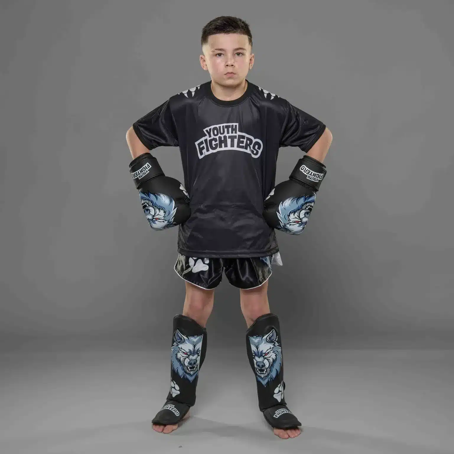 Maak je wolf-set compleet met het Youth Fighters T-shirt Kids Wolf. Dit shirt is de ideale match voor de Kids Wolves bokshandschoenen en scheenbeschermers en zorgt voor een complete en professionele uitstraling in de sportschool. Terwijl de voorkant strak is gehouden met het bekende witte Youth Fighters logo, steelt de achterkant de show met een grote, gedetailleerde print van een wolf en de tekst “WOLVES”.